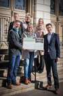 Susann Schal und Romy Rothe vom Förderverein nahmen die Spende vor dem Hauptgebäude des Gymnasiums in Form eines symbolischen Spendenschecks vom Organisationsteam entgegen.