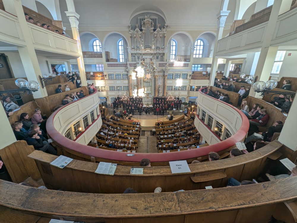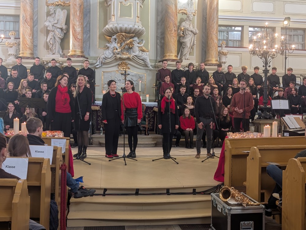 Nach intensiven Proben standen dann am Donnerstagabend die GK Musik der 11. und 12. Klassen sowie das Orchester Saitensprung vor dem festlich geschmückten Altar der Marienkirche und verzauberten die über tausend Besucher. Jeder Solist wuchs über sich hinaus und gab sein Bestes.