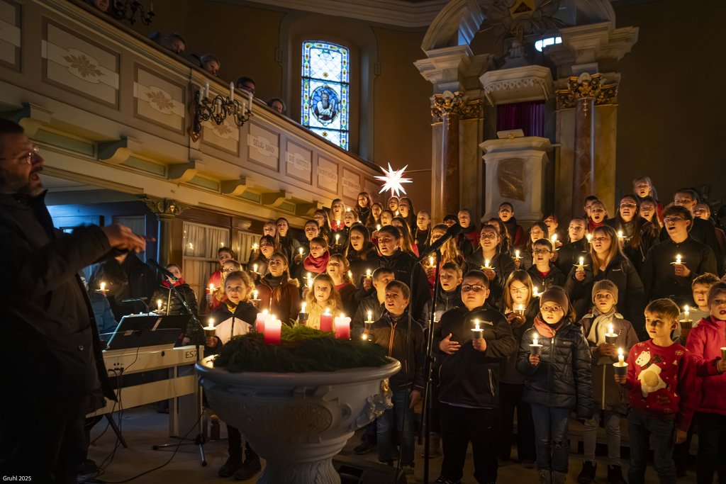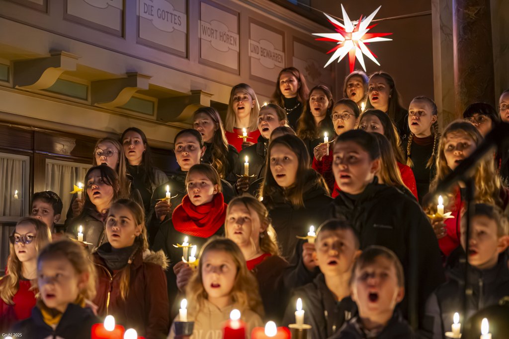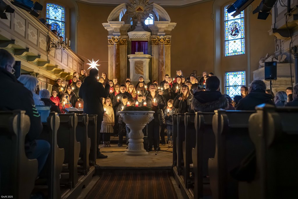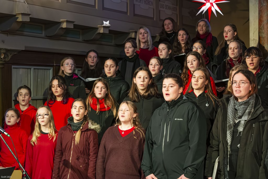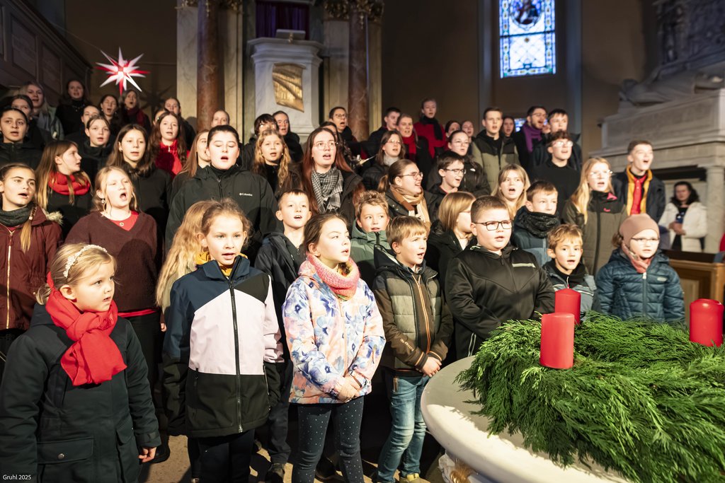 Am Sonnabend, dem 20. Dezember war Heimspiel angesagt: In der Reinersdorfer Kirche wurde der Platz knapp: im Altraraum waren wir 100 Mitwirkende: mit uns sangen die Kleine Kurrende und der Eltern-LehrerInnen-Ehemaligen-Chor. In den Kirchenbänken waren nur noch vereinzelt Plätze zu bekommen.